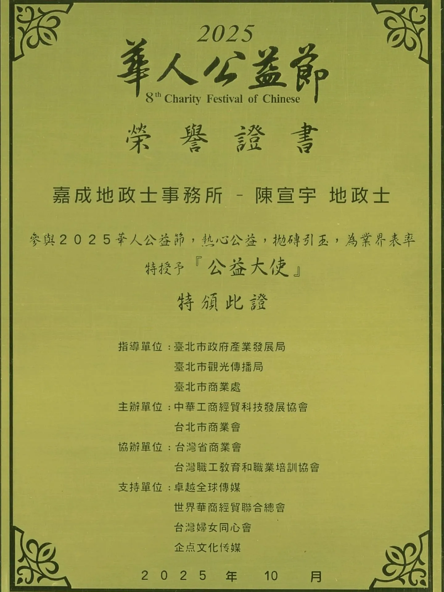 【嘉成地政士事務所|榮獲2025華人公益節「公益大使」授勳】
